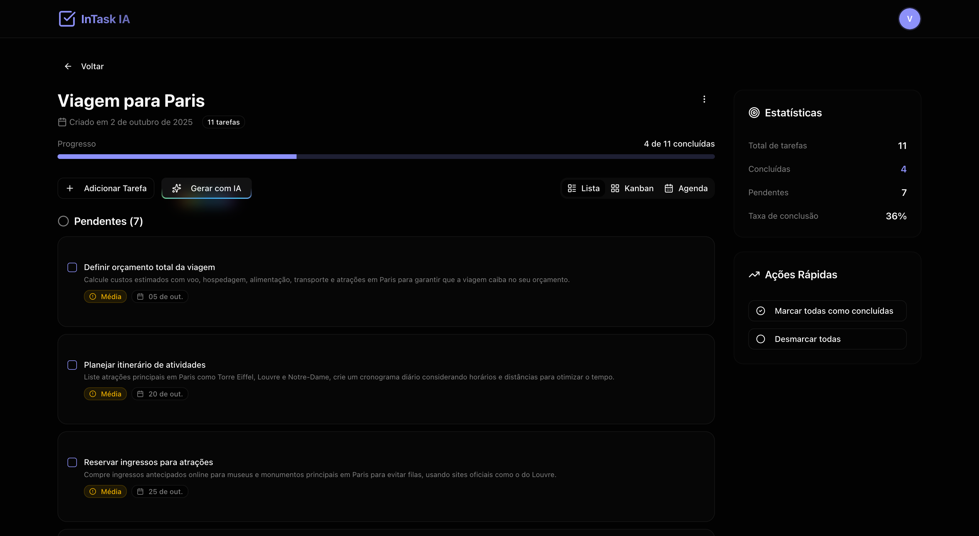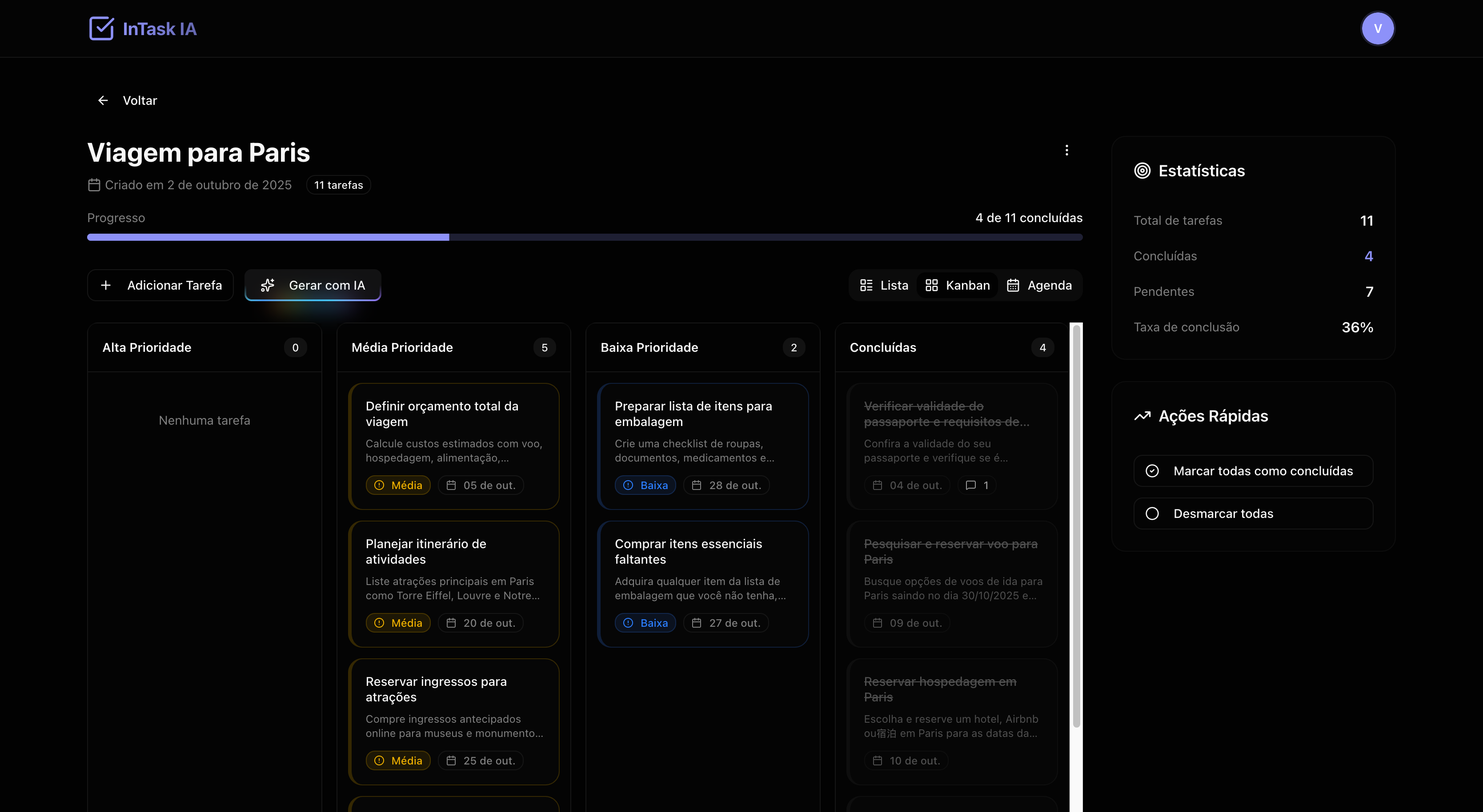 Descreva seu objetivo e a IA cria automaticamente uma lista completa de tarefas organizadas e priorizadas.